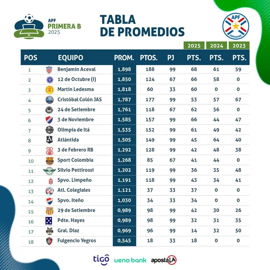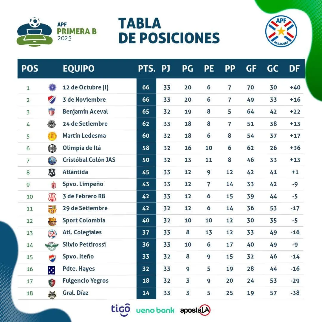 Benjamín Aceval es el virtual ascendido con 68 puntos. Por su lado, 12 de Octubre y 3 de Noviembre están con 66 puntos. Solo falta una fecha para la conclusión del torneo.